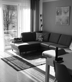 Zum Zeitpunkt des Ortstermins liegt der abgepasste Teppich im Wohnzimmer noch so, wie ursprünglich platziert. Nach Auskunft wurden seit dem Feststellen des Anhaftens keine weiteren Reinigungsmaßnahmen unter dem Textil durchgeführt. Beim vorsichtigen Zurückschlagen ist bereits eine deutliche Haftung am Untergrund festzustellen.