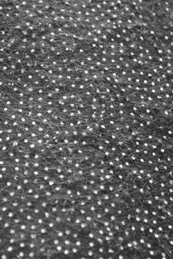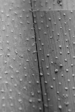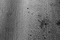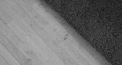 Die beschriebenen Abzeichnungen der Teppichunterseite auf der Oberfläche des Parketts zeigen sich nun als Anhaftungen: Die rückseitigen rutschbremsenden Kunststoffnoppen des Teppichs haben sich größtenteils von der Unterseite gelöst und „kleben“ nun auf der Parkettoberfläche, die rasterförmige Musterung der Noppen ist deckungsgleich auf dem Parkett und auf der rutschhemmenden Seite erkennbar.